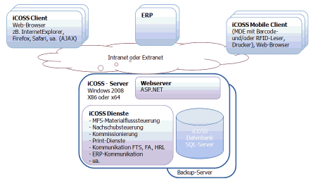 Als iCOSS-Mobile-Clients werden MDE-Geräte und/oder Staplerterminals unterstützt - einzige Voraussetzung: Web-Browser mit AJAX-Support. Die Anbindung erfolgt via WLAN/Datenfunk oder über GSM (Handynetz).